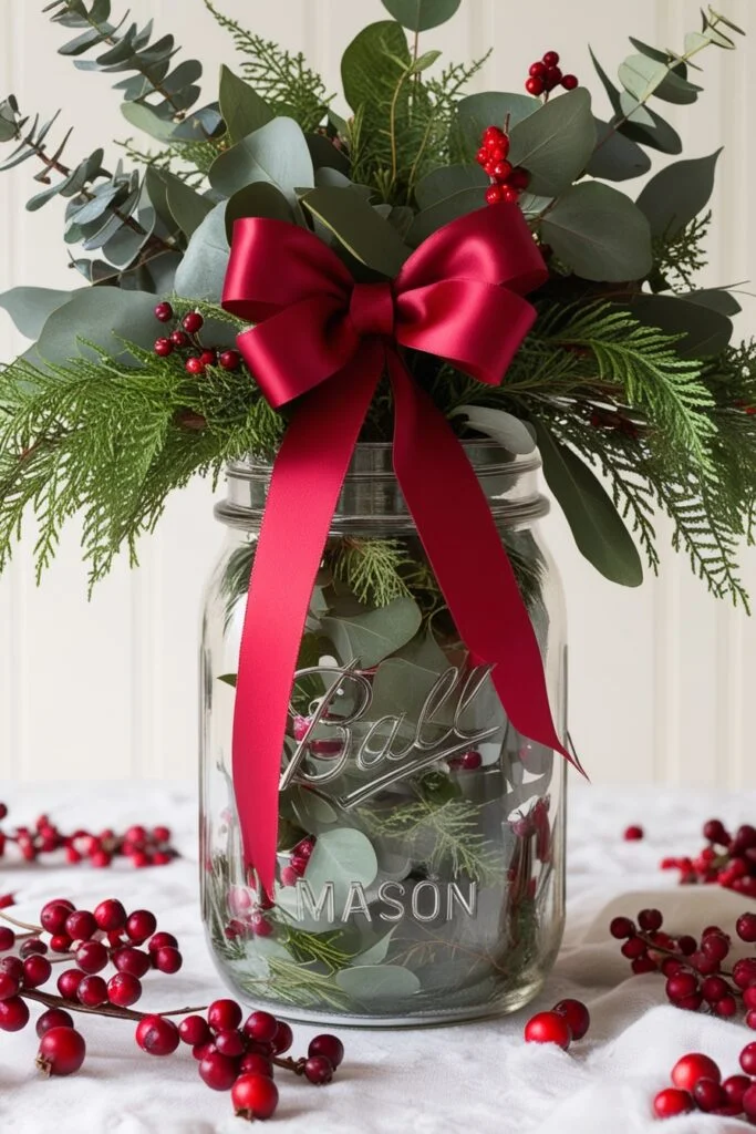 These candy cane mason jars are such a cute way to dress up your holiday table. Just glue candy canes all around the jar, tie a little holiday ribbon, and fill it with festive flowers or some fresh greenery. It’s super simple and adds that sweet Christmas vibe without trying too hard.