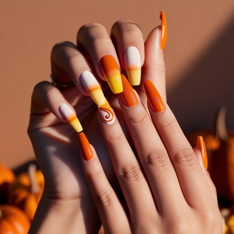 You can’t talk fall without pumpkin spice nails. This ombré blends creamy latte tones into warm pumpkin orange and it’s pure September energy. Cozy, trendy, and perfect for anyone obsessed with seasonal nail color trends.