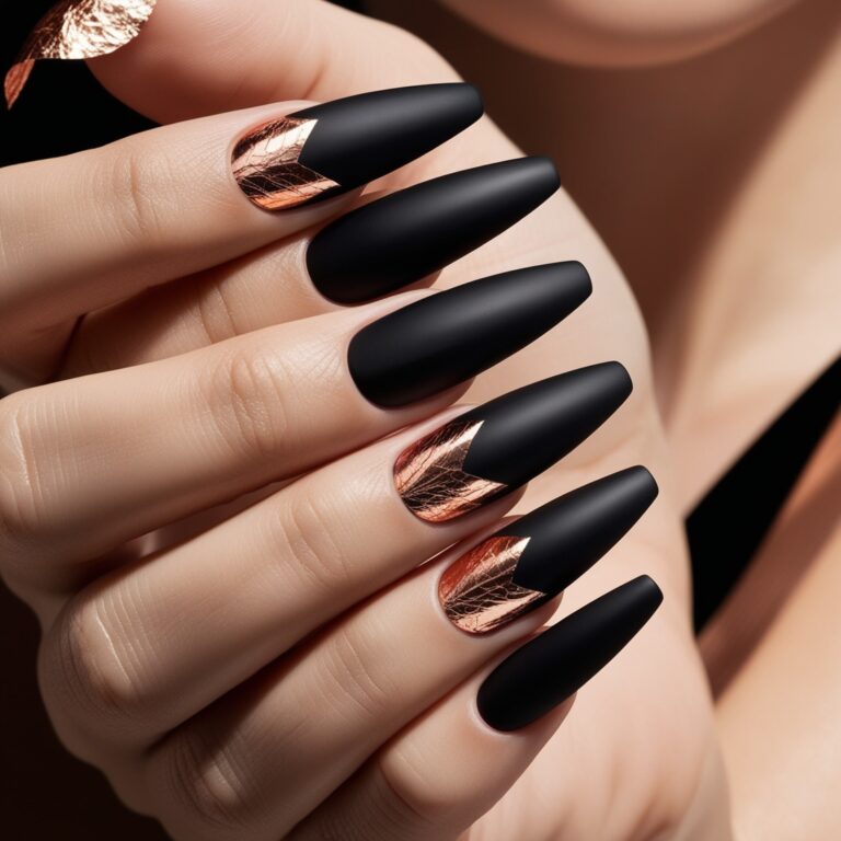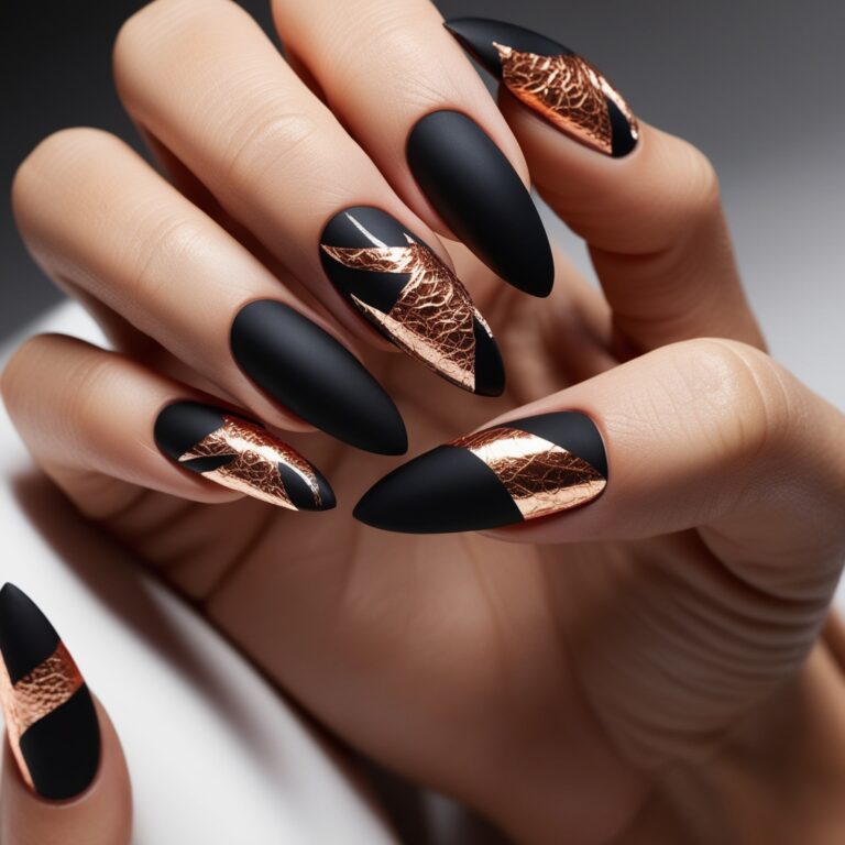 Matte black nails are bold on their own, but copper foil accents take them to another level. The warm metallic shimmer feels just like falling leaves in autumn. This look is edgy, modern, and perfect for anyone into high-fashion nail art.