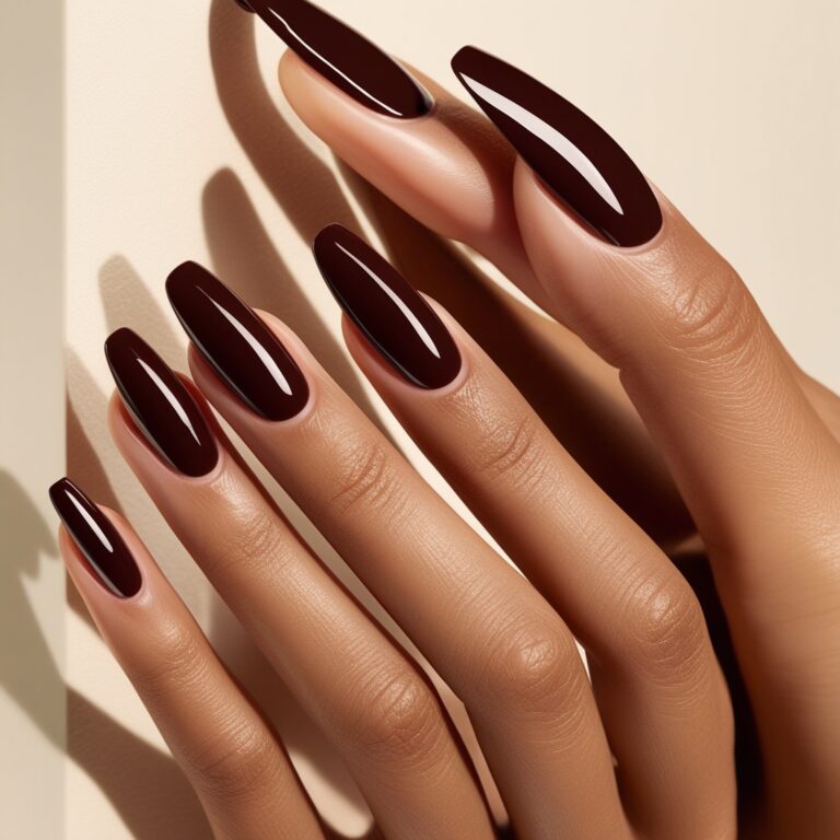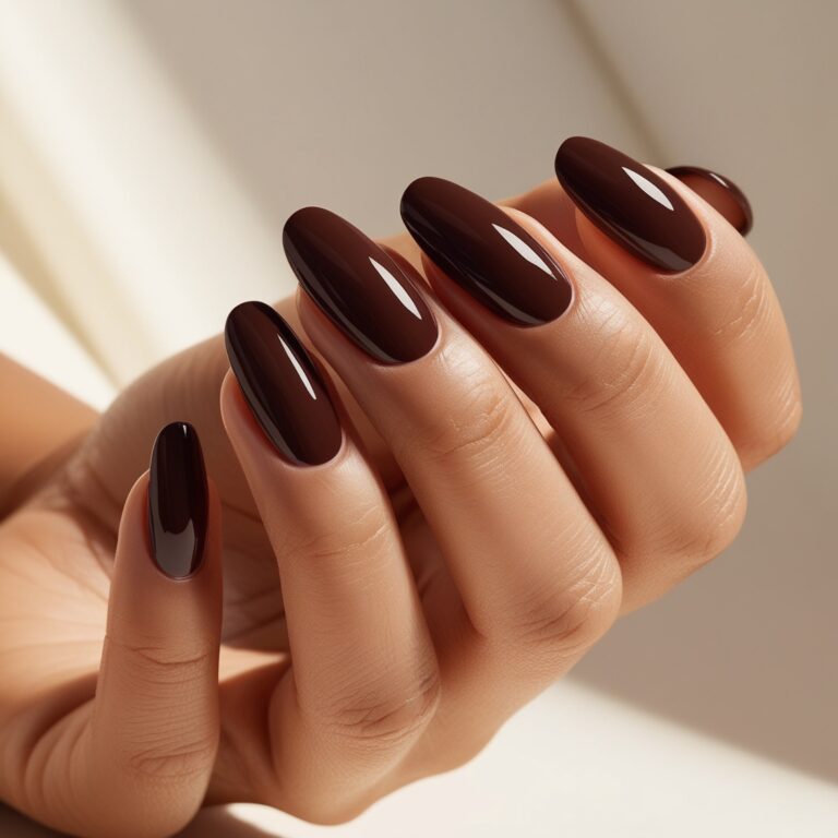 Brown nails are underrated, honestly. This rich coffee brown nail shade gives cozy fall energy and pairs with everything. Add a glossy finish and you’ve got a clean, sophisticated fall manicure that works for everyday and special occasions.