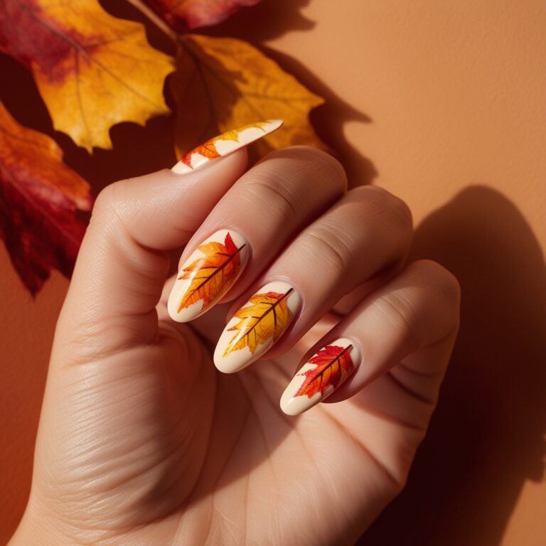Bring full fall vibes to your manicure with golden leaf nail art. These delicate leaf details look stunning on warm taupe, nude, or burnt orange bases. The gold catches the light just right and gives that soft luxury nail design feel without trying too hard. Perfect if you love classy fall nail ideas that still stand out.