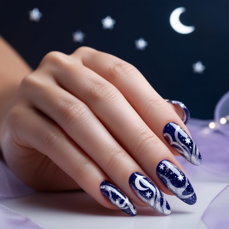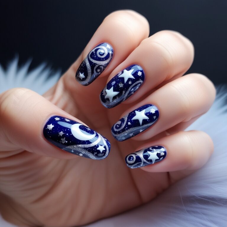 This one’s moody in the best way. A deep navy or black base with tiny stars and crescent moons gives serious celestial nail art vibes. Add a little glitter and suddenly your nails look like a crisp fall night sky. It’s bold, dreamy, and very trend-forward nail design.