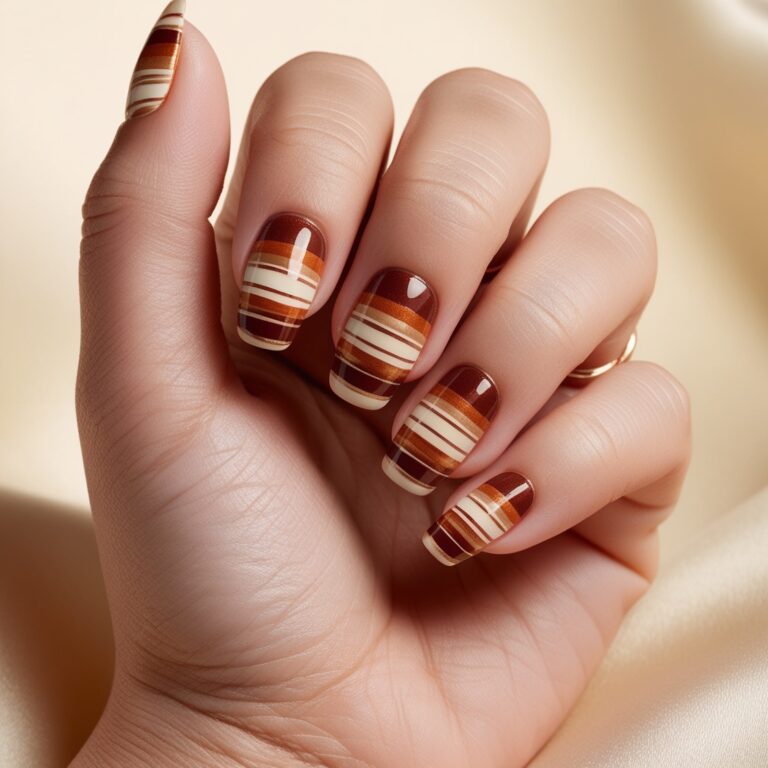 Warm cinnamon brown nails are perfect for September. Add thin white stripes and you’ve got a clean but eye-catching look. It’s simple, cozy, and very on-brand for fall nail trends. Easy to wear, easy to love.