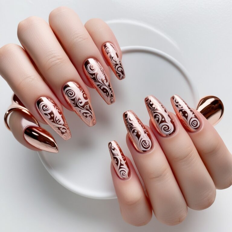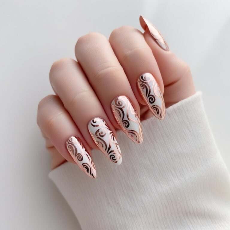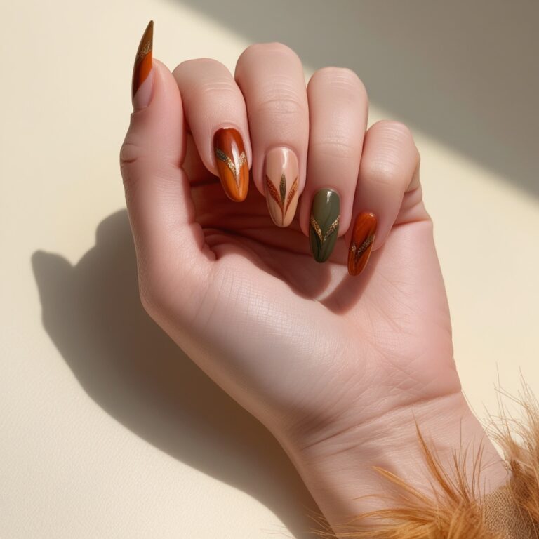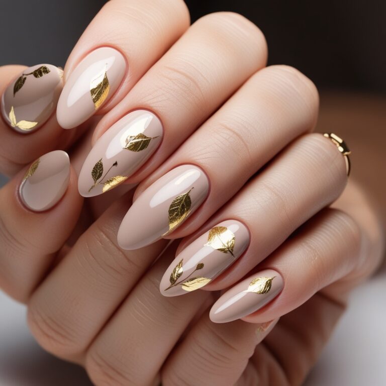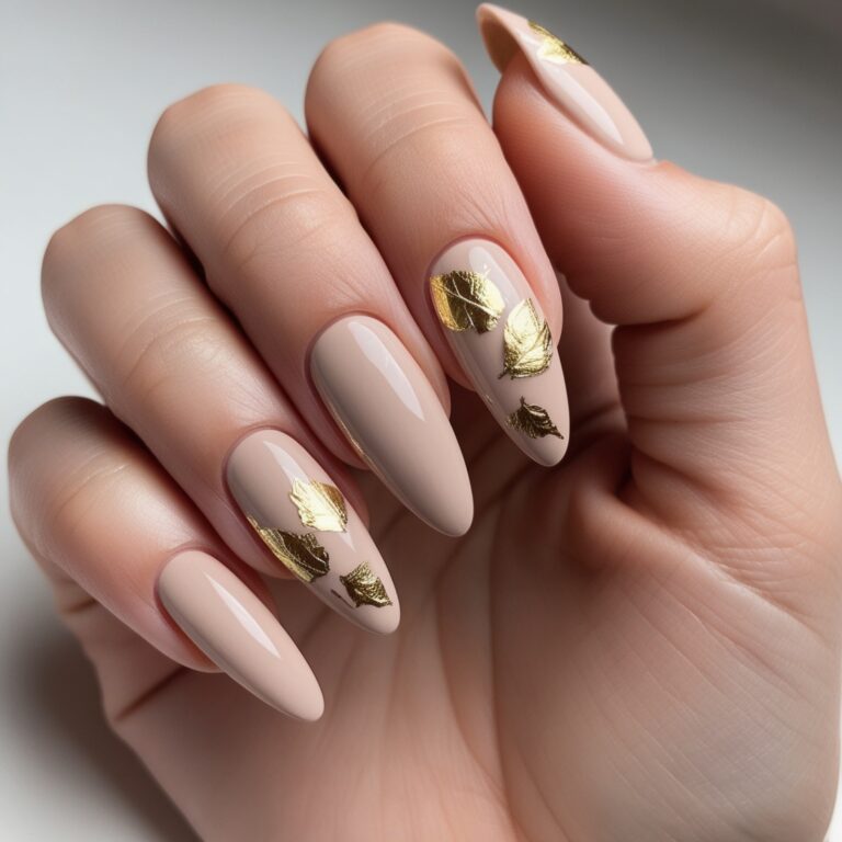 Soft nude nails with rose gold foil accents are simple but stunning. The metallic details add just enough shine without going overboard. It’s elegant, modern, and perfect for everyday fall nail designs.