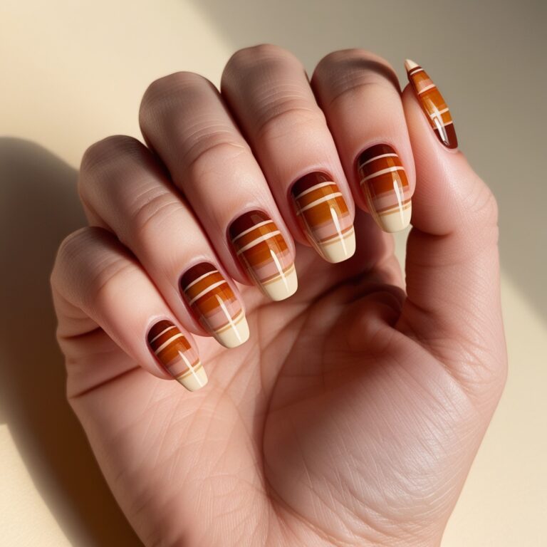 Plaid nails are basically flannel season in manicure form. Using warm shades like mustard, deep red, and chocolate brown, this plaid nail design feels playful but still stylish. Perfect for sweater weather and anyone who loves bold fall nail art trends.