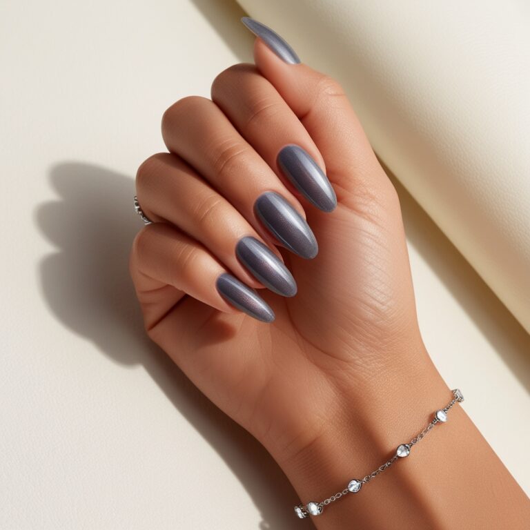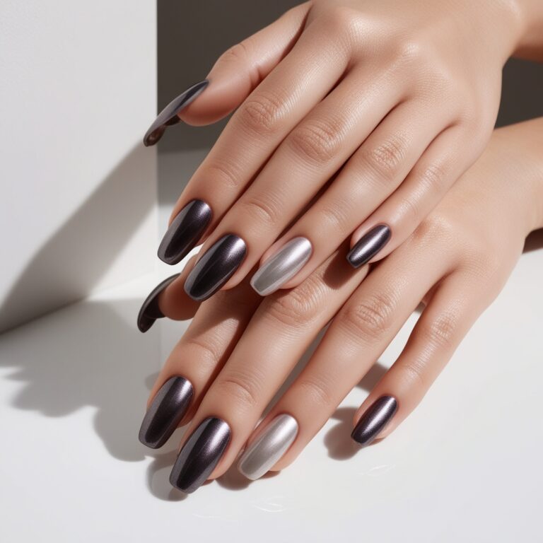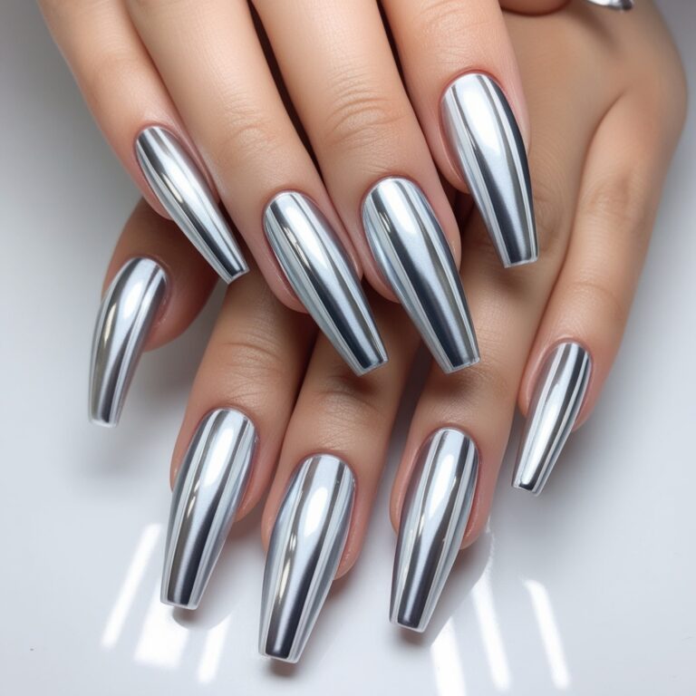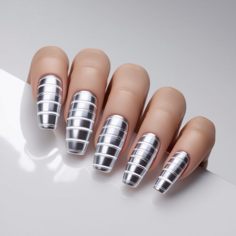 Clean, modern, and super chic. Thin silver chrome stripes over charcoal or dark blue nails keep things simple but polished. This look is perfect if you like minimal luxury nail designs that still feel fresh and salon-worthy. Subtle, but expensive-looking.