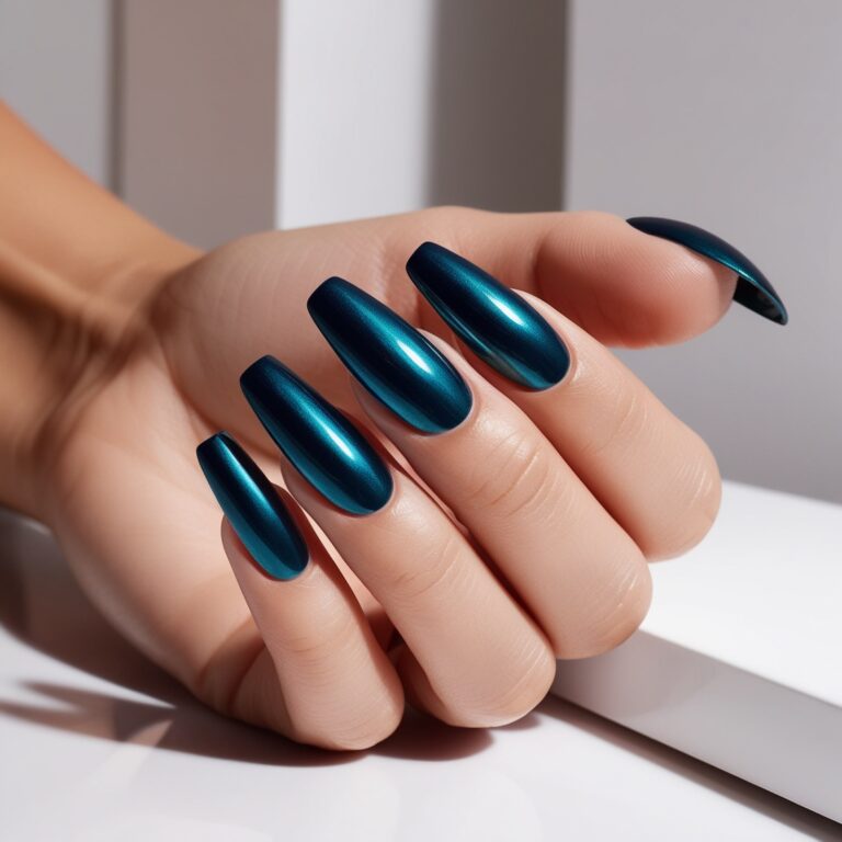If you want something bold but still classy, teal chrome nails are the move. The deep teal base feels cool and crisp for fall, and the chrome top coat adds that modern, high-end edge. It’s sleek, trendy, and very nail-salon chic.