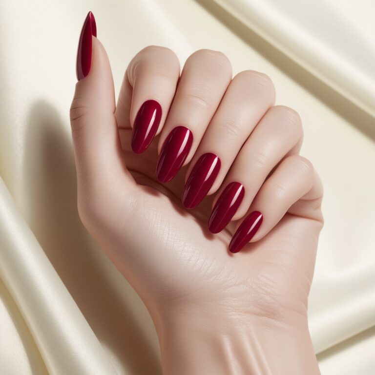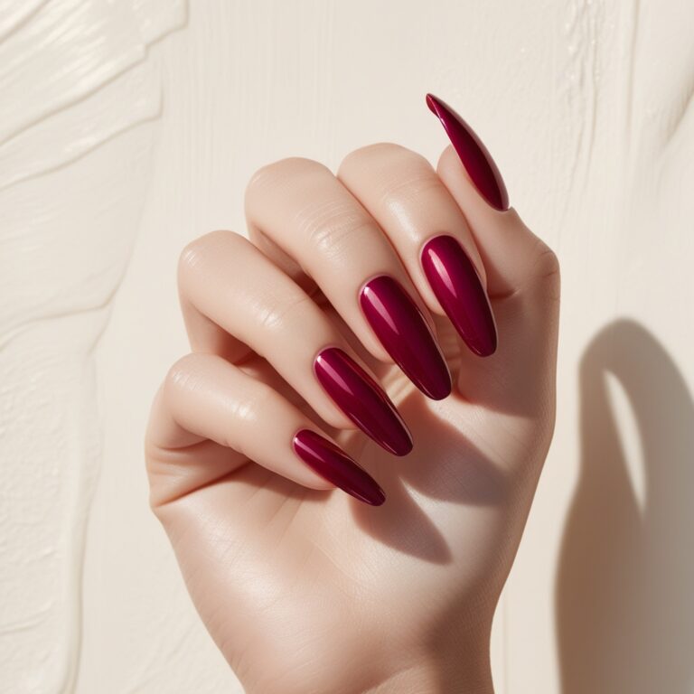Deep burgundy nails already feel luxe, but add tiny crystal nail embellishments near the cuticle and they instantly look regal. This style gives serious luxury fall manicure vibes without being over the top. Perfect if you love elegant acrylic nails or long-lasting gel nail designs for fall.