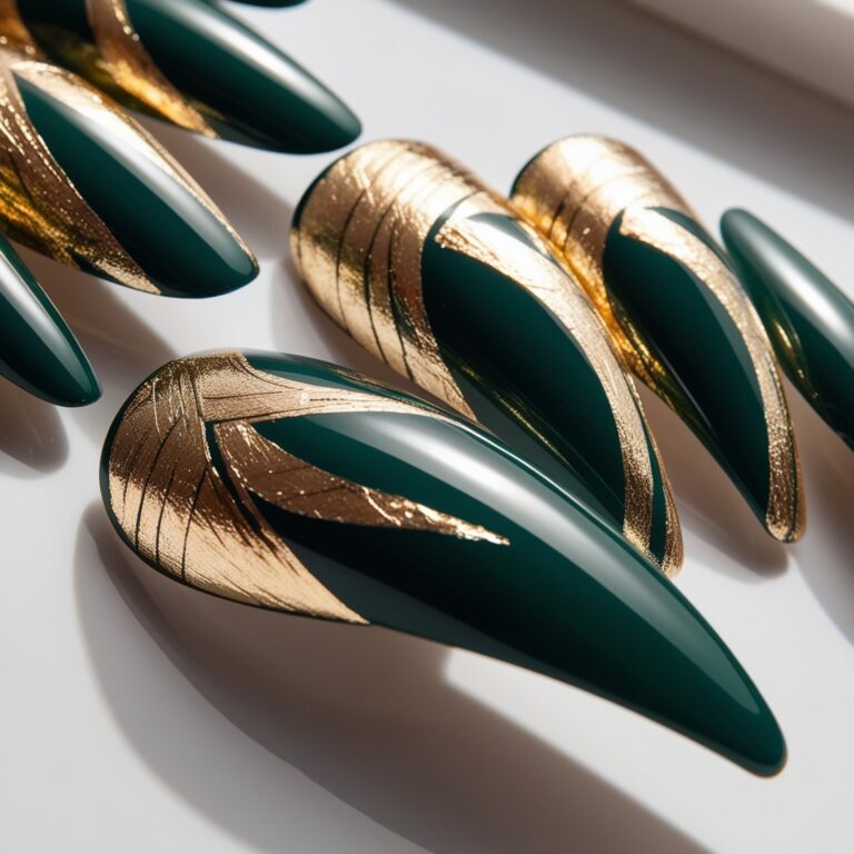 Deep forest green nails scream autumn. Add a few random gold foil nail accents and suddenly your manicure looks straight out of a high-end nail salon. This combo feels earthy, rich, and a little glam. Great for gel nails or acrylic manicures when you want something elegant but bold.