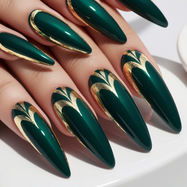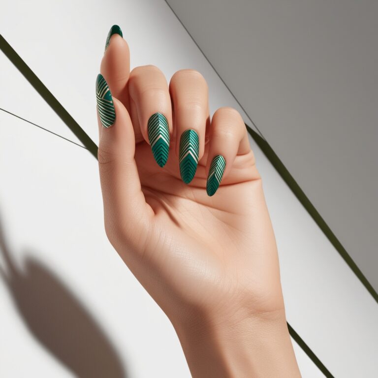 Deep emerald green nails always feel rich for fall. Add thin geometric nail lines in white or gold and the whole look turns sleek and modern. It’s clean, stylish, and perfect if you’re into contemporary nail art trends.