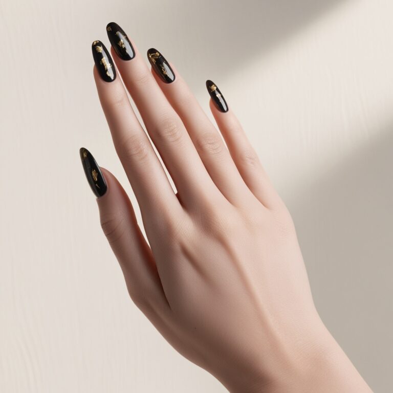 A dark charcoal nail base with tiny gold leaf flakes feels moody and expensive. The contrast is dramatic but still elegant, making this a great choice for a bold fall nail design that doesn’t feel overdone.