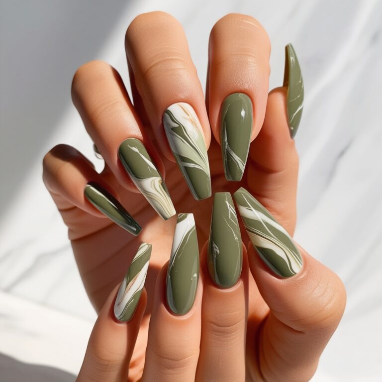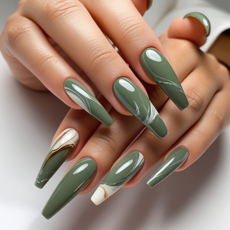 Marble nails always hit, especially in fall. Olive green marble nails mixed with soft white and hints of gold feel rich and elevated. It gives that stone-inspired, designer nail vibe without being too loud. Ideal if you want elegant fall nail art that works for everyday wear.
