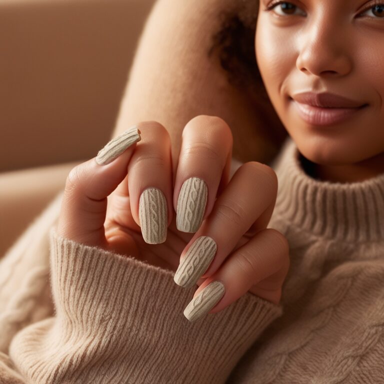 These are peak cozy. Sweater nail designs use raised patterns to mimic knit fabric, usually in soft beige, cream, or nude shades. They’re subtle but creative and look amazing for everyday wear. Ideal if you love soft fall nail art that feels warm and comfy.