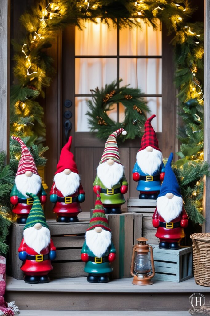 Add a dash of whimsy with Christmas gnome figurines. These cute little guys are a fun and quirky way to bring some personality to your porch and make your holiday decor stand out.