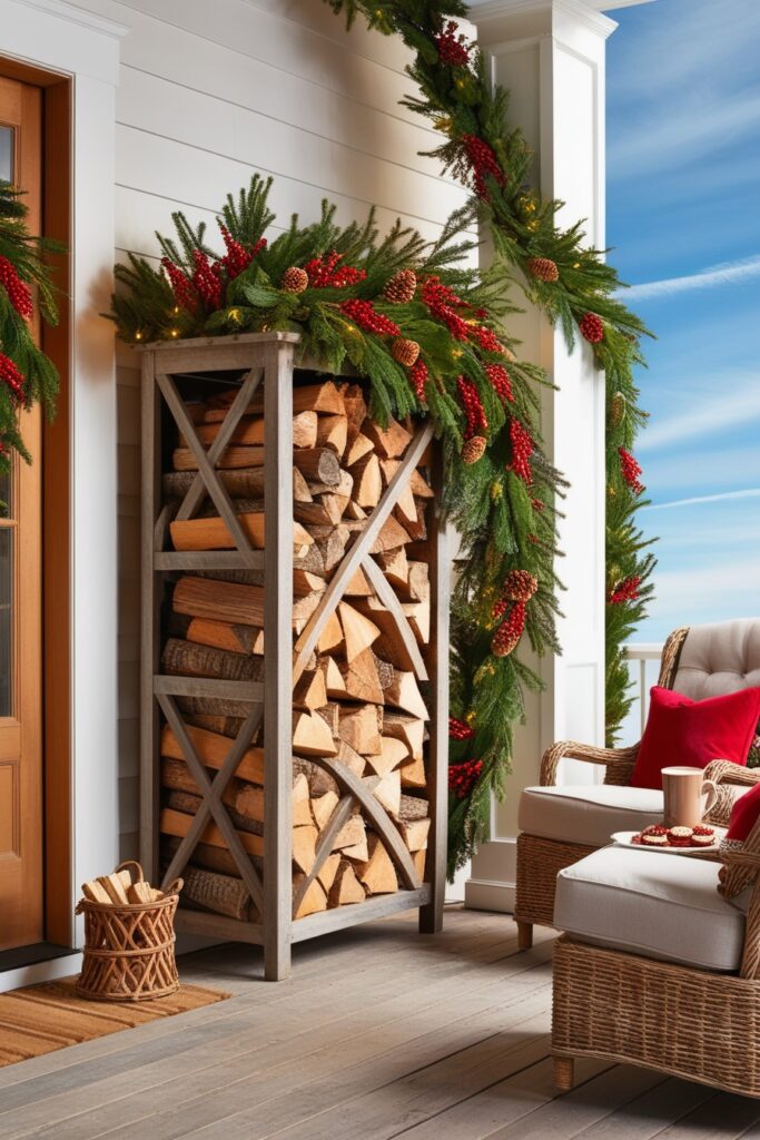 If you’ve got a fireplace or wood-burning stove, make use of your firewood by creating a cozy display on your porch. Stack the logs neatly in a decorative holder and add some holiday greenery to make it feel festive and homey.