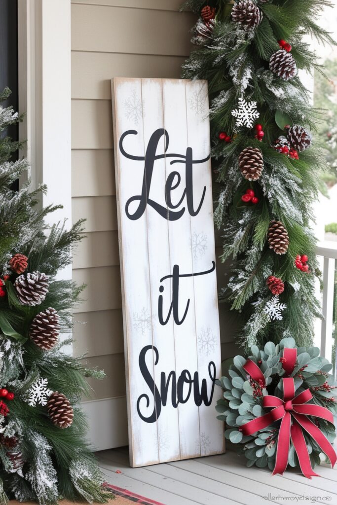 Add a little farmhouse charm with rustic wooden signs that feature holiday phrases like “Let it Snow” or “Joy to the World.” You can prop them against the wall or place them near your front door for an extra cozy, welcoming feel.