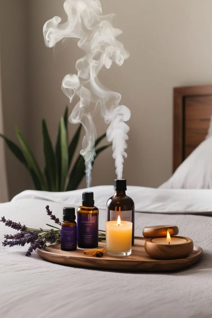 Scents matter. Aromatherapy can totally change the mood. Use essential oil diffusers or scented candles with lavender, vanilla, rose, or sandalwood. These scents help you relax, unwind, and create a sensual bedroom atmosphere that feels calm and inviting.