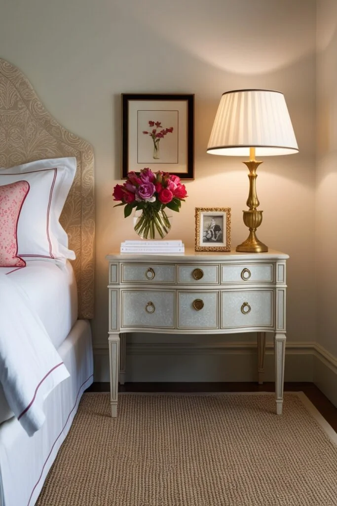 Side tables help tie the whole room together. Choose elegant nightstands that match your romantic bedroom style. Add soft lamps, candles, fresh flowers, or personal items. Small details like this make the space feel balanced and intimate.
