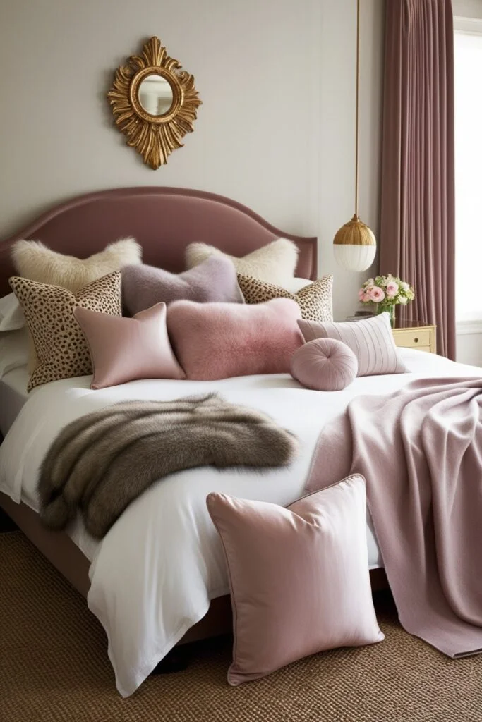 Pillows and throws aren’t just decor. They’re comfort. Mix faux fur, silk, velvet, or cashmere textures for that luxury bedroom feel. Layer them on the bed to make it look plush and inviting. Perfect for cuddling and slow nights in.