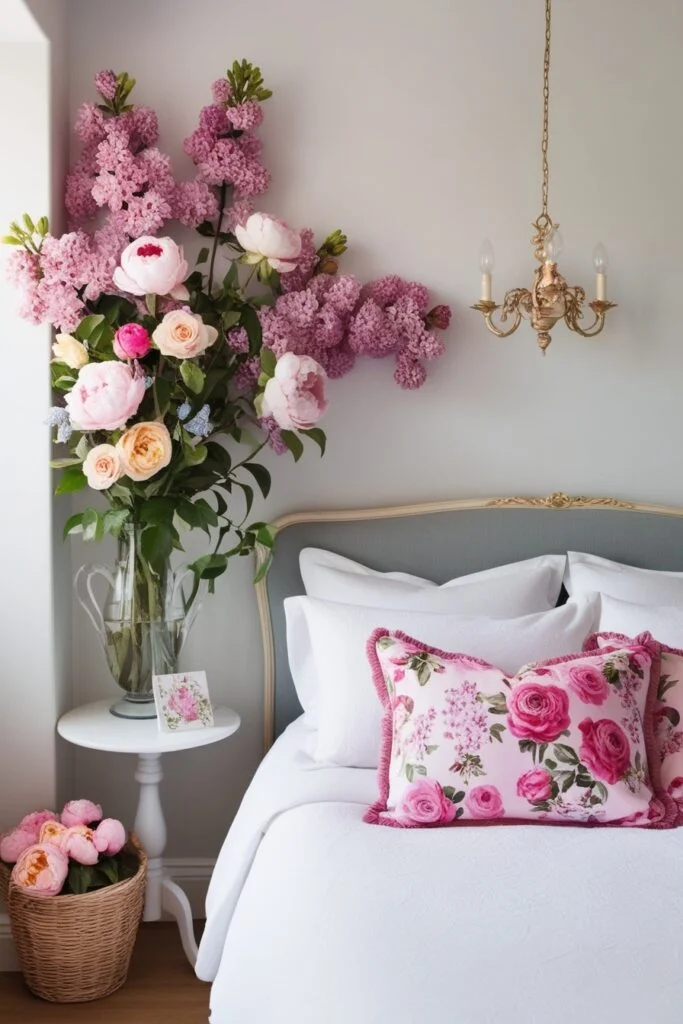 Flowers never miss when it comes to romance. Fresh blooms like roses, peonies, or hydrangeas add color, softness, and a natural romantic touch. Floral bedroom decor also brings in gentle scents that help set a calm, love-filled mood. Simple but powerful.