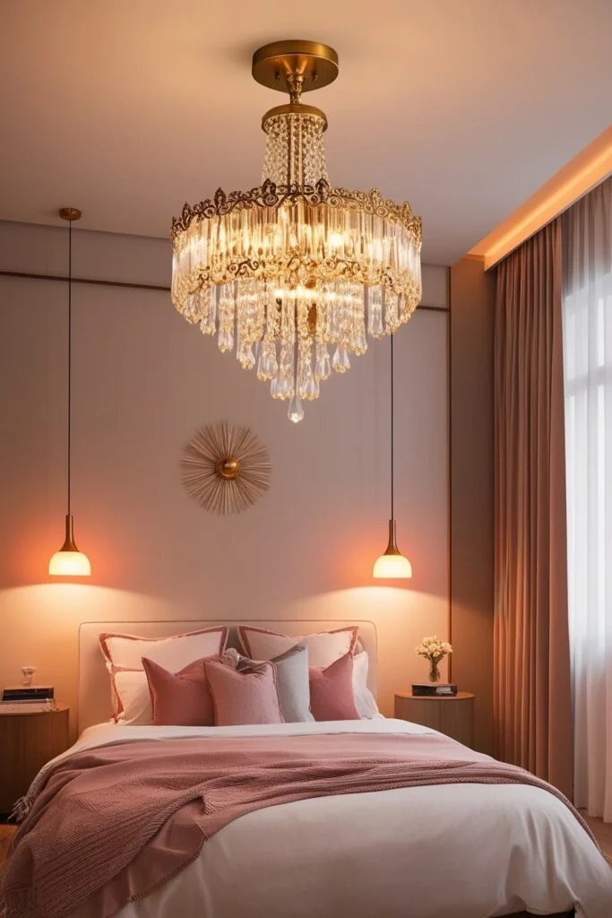 Ceiling lights can be romantic too. A chandelier or pendant light with warm bulbs adds drama without being too much. Choose a design that fits your style, modern or classic. The soft glow helps create an intimate bedroom atmosphere that feels relaxed and cozy.