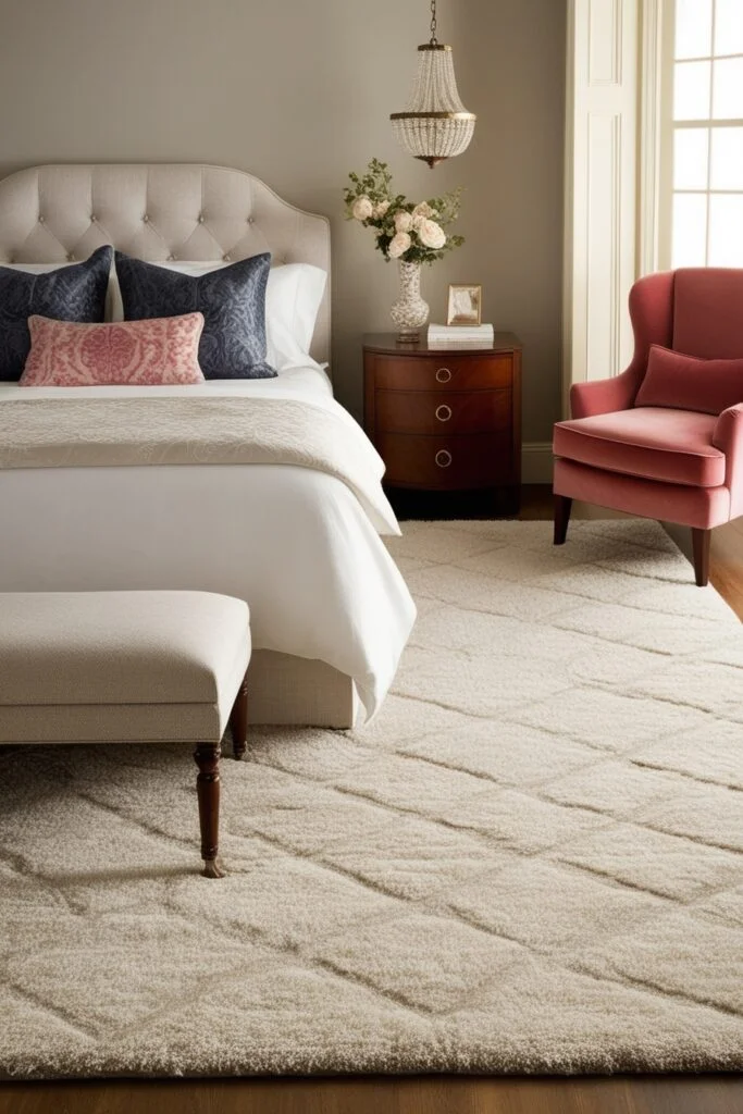 A plush carpet underfoot brings warmth and softness to your bedroom. Choose a large, A soft carpet makes a big difference. Plush bedroom rugs add warmth and comfort, especially first thing in the morning. Neutral colors keep it calm, while patterns add personality. Either way, it makes your romantic bedroom feel cozy and complete.