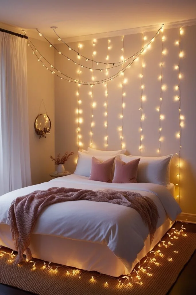 String lights are simple but powerful. They add instant romance without much effort. Drape them around the bed frame, across the wall, or through a canopy. The soft glow creates a magical bedroom atmosphere that feels warm, intimate, and relaxed.