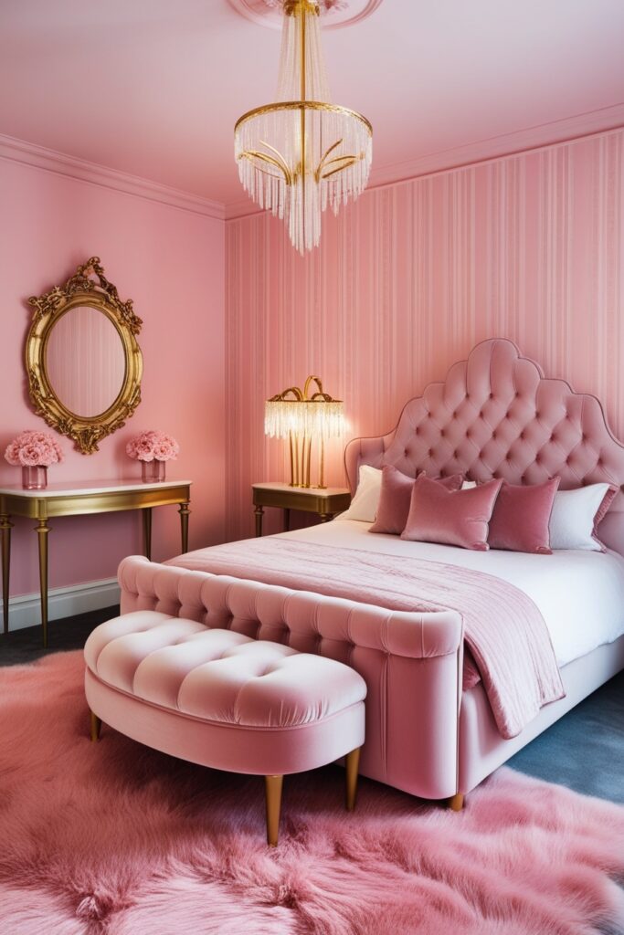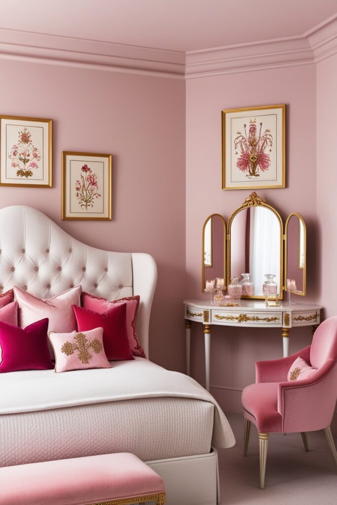 This pink princess bedroom feels straight out of a fairy tale. Soft pink shades, luxe textures, and feminine decor set the mood. A canopy bed with sheer curtains adds that royal bedroom vibe. Velvet pillows, gold accents, and crystal details make the space feel magical and elegant. Perfect for girls who love dreamy bedroom ideas with a touch of luxury.