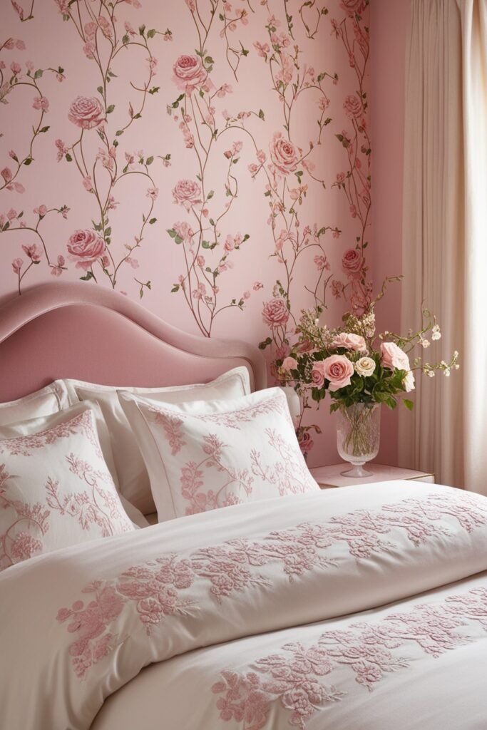 Floral bedroom decor is perfect for a soft, romantic vibe. Pink floral wallpaper or bedding adds charm without feeling too busy. White furniture and light fabrics keep the space fresh and bright. Finish it off with fresh flowers or floral wall art. This dreamy bedroom idea feels calm, pretty, and full of feminine energy.