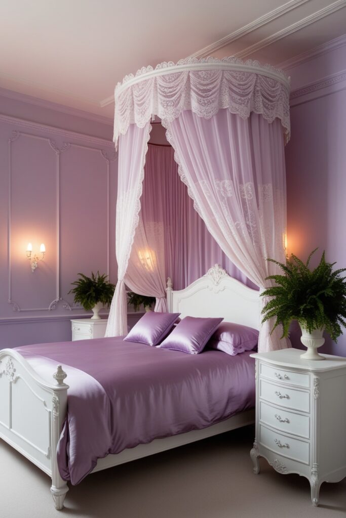 Lavender is a calm but stylish choice for a girly bedroom design. It brings soft luxury without feeling too much. Paired with white furniture and cozy lighting, it creates a peaceful retreat. A canopy bed, lace curtains, and warm fairy lights make the room feel dreamy and relaxing. Ideal for girls who love romantic bedroom decor with a modern touch.
