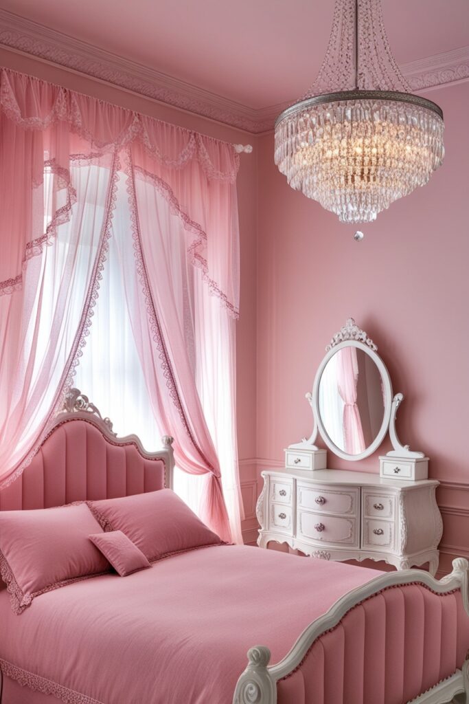 This pastel pink and white bedroom feels straight out of a fairy tale. Soft pink walls, white furniture, and elegant decor set the mood. A canopy bed, chandelier lighting, and luxe fabrics like velvet or lace make it feel royal. It’s the perfect princess bedroom idea for girls who love dreamy, elegant spaces with a touch of magic.