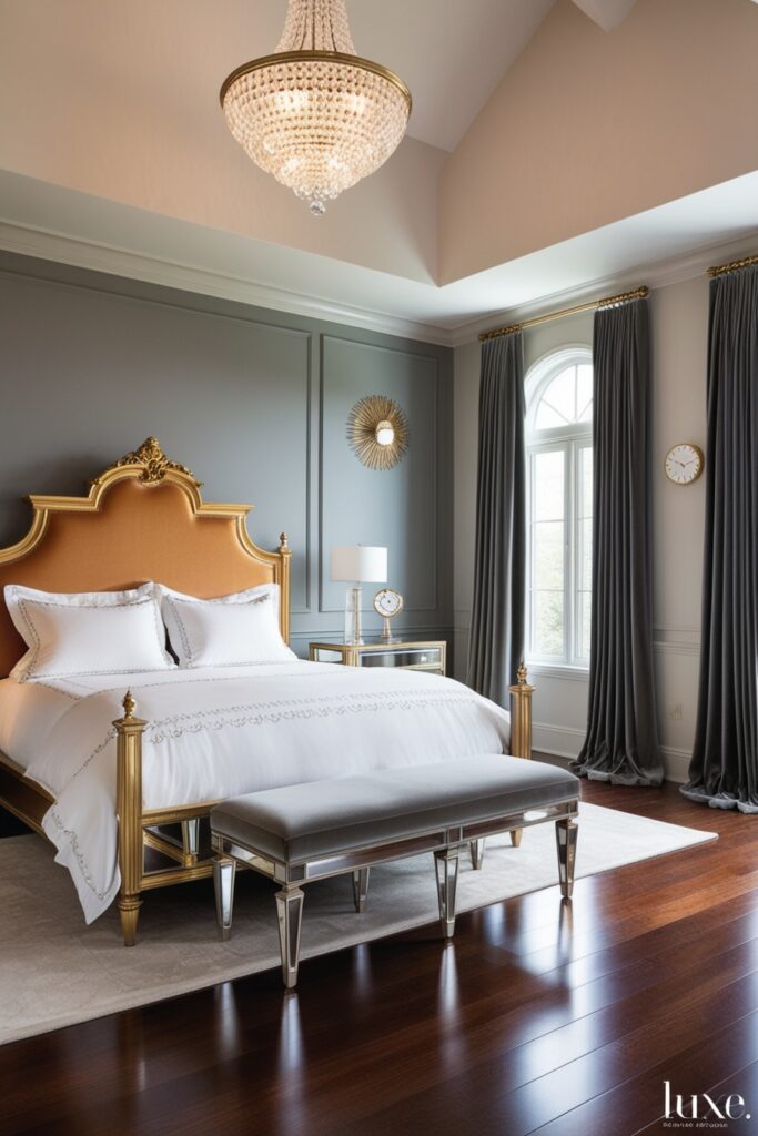 Metallic bedroom accents instantly level up your space. Gold, silver, or rose gold finishes bring that high-end interior design feel. Mirrored furniture, metallic decor, and statement lighting add shine and depth. The room feels modern, stylish, and luxurious without trying too hard. Perfect for a glam bedroom with a chic vibe.