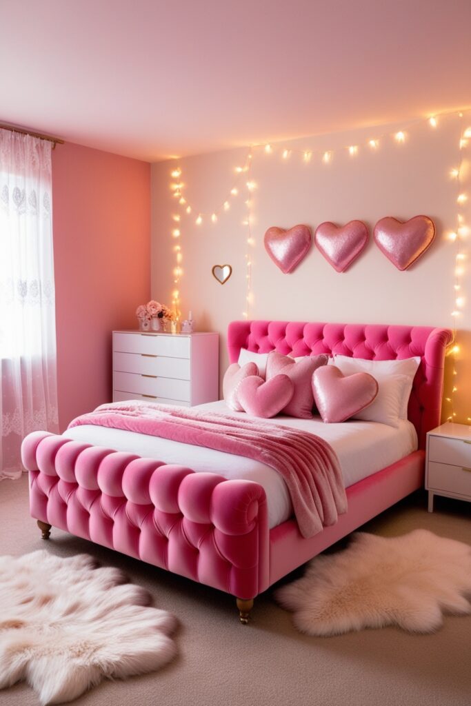 This candy pink bedroom is made for girls who love bold colors and fun vibes. Hot pink walls, matching bedding, and soft white decor instantly brighten the space. It feels playful and full of life. Add heart-shaped pillows, fairy lights, and plush textures for that cute, Instagram-worthy look. Perfect for a girly bedroom that feels happy, cozy, and full of personality.