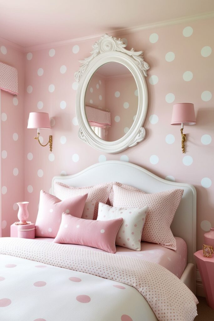 Polka dots never get old. Pink and white polka dot decor adds instant personality to a girly bedroom. Use it on wallpaper, bedding, or curtains for a playful touch. Keep the furniture white to tone things down. This look is fun, cute, and full of charm. Great for girls who want a lively and creative bedroom design.